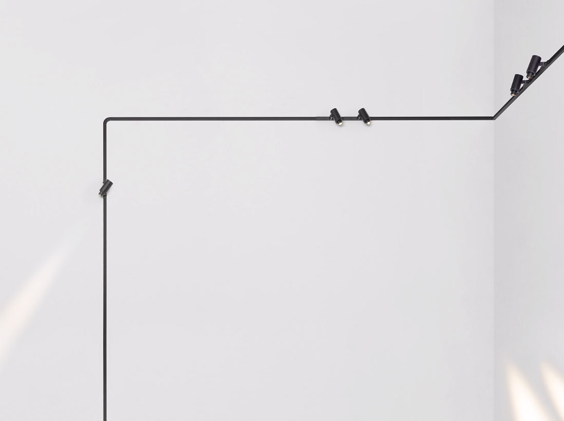 El sistema está formado por un perfil de aluminio anodizado negro mate junto con un conductor flexible de sección rectangular. Los dos elementos se fusionan en una uniformidad visual total en todo su recorrido.