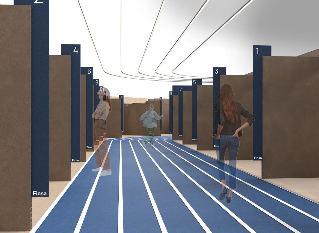 Ferrero, que participó como diseñador emergente en las tres primeras ediciones del Salón nude y que en 2012 fue el responsable del diseño conmemorativo por su décimo aniversario, aporta en esta ocasión una visión renovada del espacio: una pista abierta al futuro inspirado en las pistas de atletismo y en la energía vital que caracteriza a los creadores emergentes.