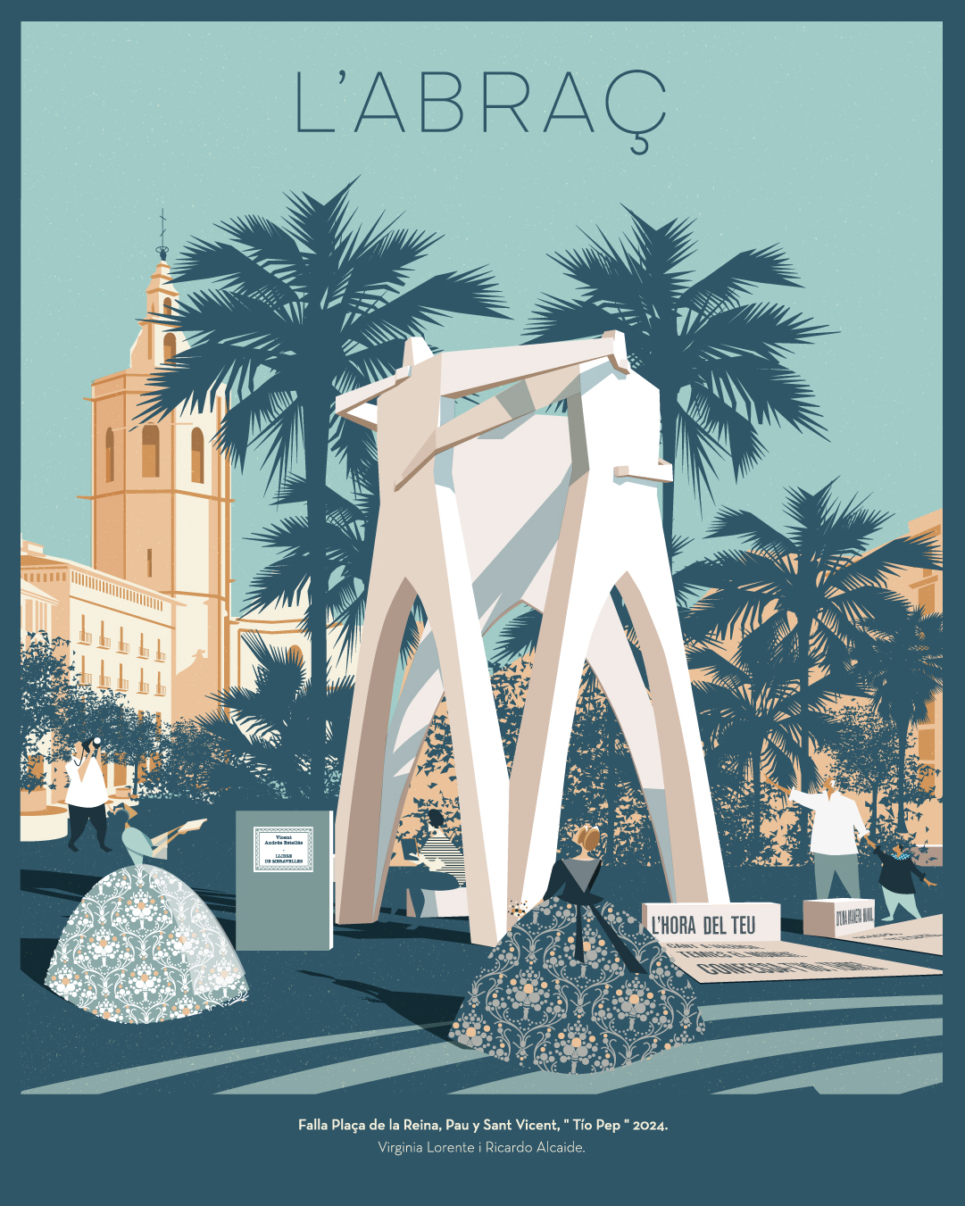 El diseño de la Falla Tío Pep, (comisión Plaza de la Reina, Paz y San Vicente) centrado en el centenario de Vicent Andrés Estellés, fue confiado a la arquitecta e ilustradora Virginia Lorente con la colaboración del diseñador Ricardo Alcaide. El proyecto representa la obra del poeta con un abrazo, simbolizando la conexión con la cultura valenciana. La colaboración con EASD València fue esencial para el diseño, que incluye realidad aumentada. La experiencia destaca la importancia de la colaboración entre diseñadores y las Fallas.
