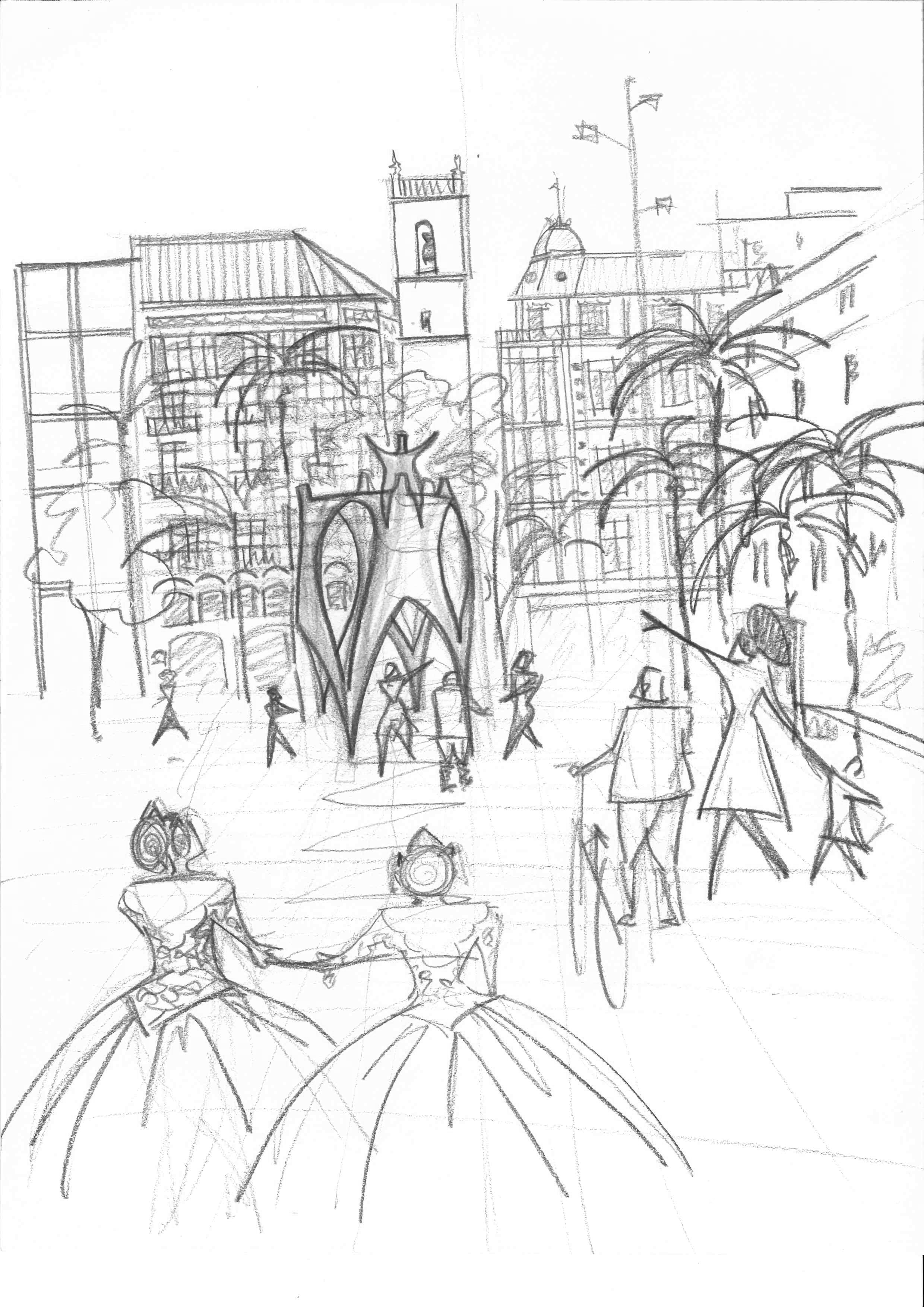 Virginia Lorente: Habían dos cuestiones que me interesaban muchísimo, por un lado la ubicación de la falla en la Plaza de la Reina. Se trata de un espacio conmovedor, lo recorres visualmente y parece que todo está allí, es el corazón de la ciudad, el Micalet, Santa Catalina, la Paz, San Vicente… había que dialogar con ello, enmarcarlo. A través de los poemas de Estellés hemos recorrido estas calles, hemos sido capaces de vivirlas, escucharlas, olerlas… Decía Joan Fuster sobre Estellés: «No escriu per al poble, escriu des del poble», fue “la veu del poble”, no utilizaba metáforas, ni palabras grandilocuentes, quizá por ello nos sentimos tan identificados con sus poemas,
